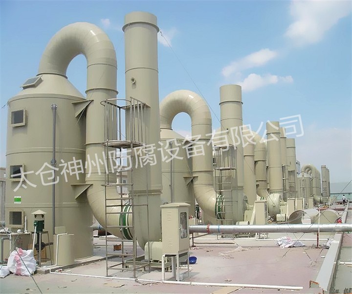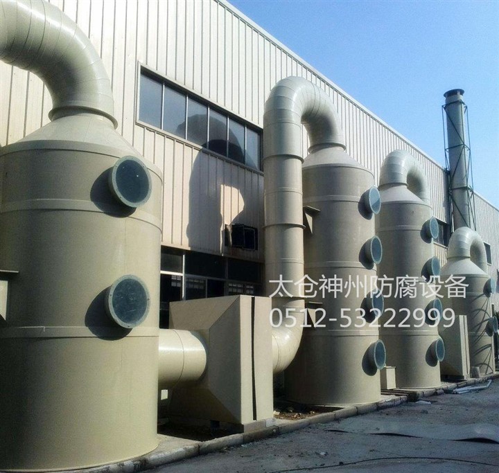 洗滌塔系統之風機組將收集到的廢氣吸入洗滌塔內,流經填充層段(氣/液接觸 反應之介質),讓廢氣與填充物表面流動的藥液(洗滌液)充分接觸,以吸附廢氣中所含的酸性或堿性污物。洗滌后,廢液收集至集水槽中,再排放至廢水系統處理。