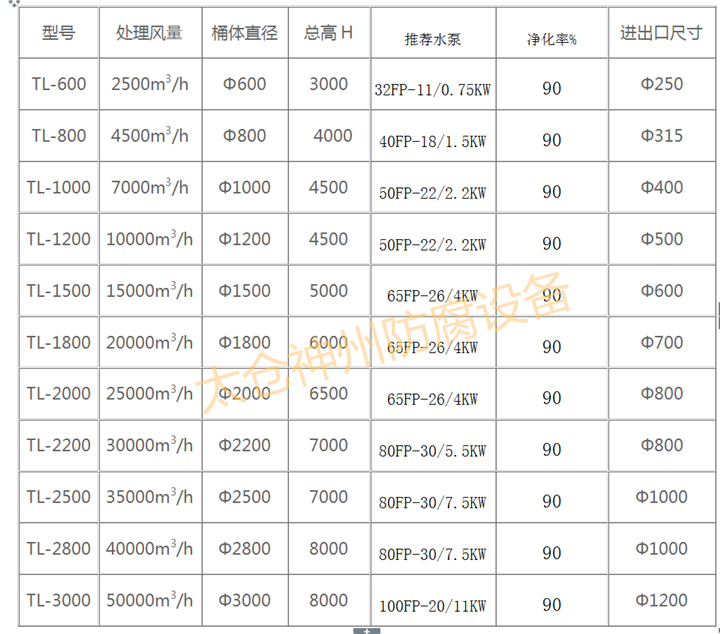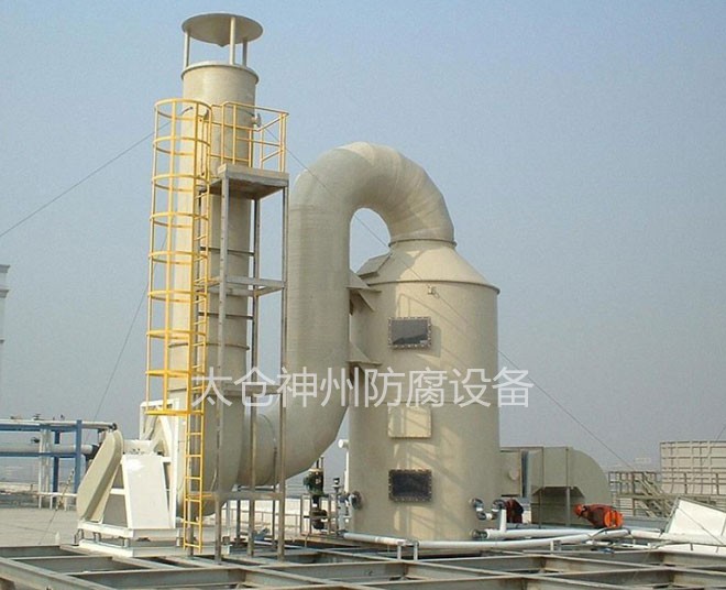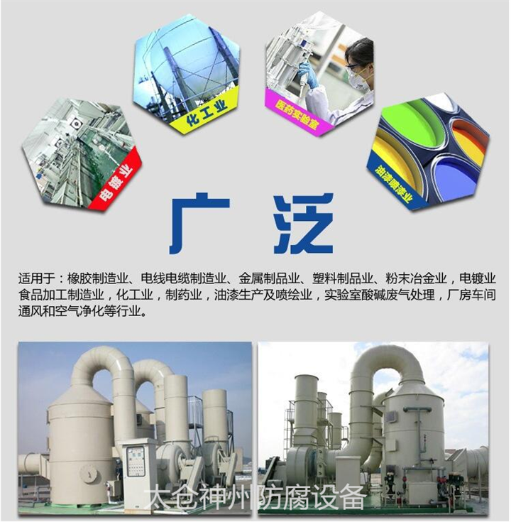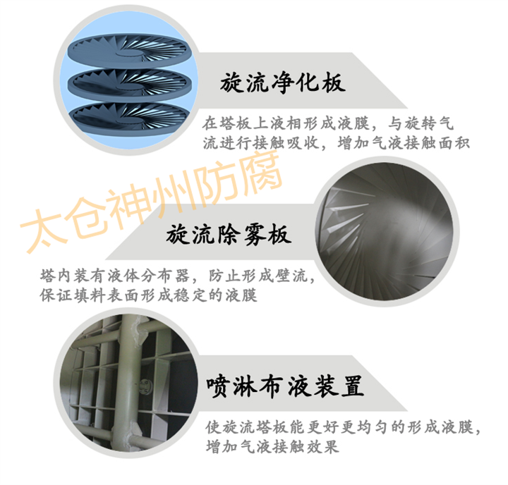 旋流塔為逐級接觸式氣液傳質設備,塔內液體依靠重力作用,由上層塔板的降液管流到下層塔板的受液盤,然后橫向流過塔板,從另一 側的降液管流至下一層塔板。氣體則在壓力差的推動下,自下而上穿過各層塔板的氣體通道,分散成小股氣流,在塔板上,氣液兩相密 切接觸,進行熱量和質量的交換。在板式塔中,兩相的組成沿塔高呈階梯式變化,在正常操作下,液相為連續相,氣相為分散相。廣泛 應用于NH3、Hcl、H2S、氮氧化物及漆霧等有機廢氣處理,特別適用于含少量粉塵的廢氣。旋流板塔作為脫硫塔或傳質吸收塔使用時, 空塔氣速一般控制在1.25-2.25m/s左右,作為除塵脫硫塔空塔氣速一般控制在2.25-2.6m/s左右